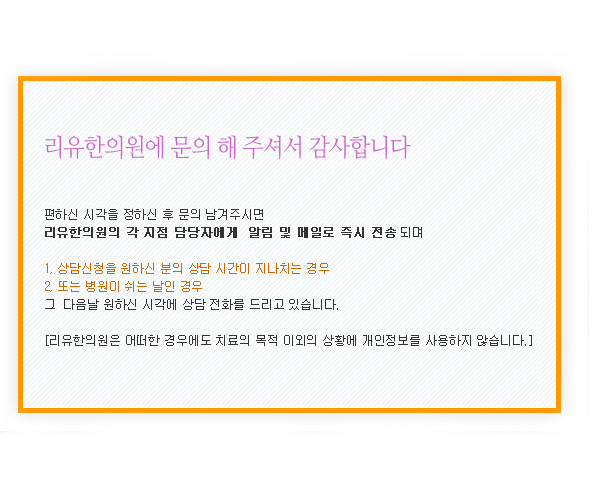[¸®À¯ÇÑÀÇ¿øÀº ¾î¶°ÇÑ °æ¿ì¿¡µµ Ä¡·áÀÇ ¸ñÀû ÀÌ¿ÜÀÇ »óȲ¿¡ °³ÀÎÁ¤º¸¸¦ »ç¿ëÇÏÁö ¾Ê½À´Ï´Ù.] ¸®À¯ÇÑÀÇ¿ø´Â ±ÍÇÏÀÇ °³ÀÎÁ¤º¸º¸È£¸¦ ¸Å¿ì Áß¿ä½ÃÇϸç, °³ÀÎÁ¤º¸º¸È£¹æÄ§À» ÅëÇÏ¿© ±ÍÇϲ²¼ Á¦°øÇϽô °³ÀÎÁ¤º¸°¡ ¾î¶°ÇÑ ¿ëµµ¿Í ¹æ½ÄÀ¸·Î ÀÌ¿ëµÇ°í ÀÖÀ¸¸ç °³ÀÎÁ¤º¸º¸È£¸¦ À§ÇØ ¾î¶°ÇÑ Á¶Ä¡°¡ ÃëÇØÁö°í ÀÖ´ÂÁö ¾Ë·Áµå¸³´Ï´Ù. °³ÀÎÁ¤º¸ ¼öÁý¿¡ ´ëÇÑ µ¿ÀÇ ¸®À¯ÇÑÀÇ¿ø´Â ±ÍÇϲ² ȸ¿ø°¡ÀԽà °³ÀÎÁ¤º¸º¸È£¹æÄ§ ¶Ç´Â ÀÌ¿ë¾à°üÀÇ ³»¿ëÀ» °øÁöÇϸç ȸ¿ø°¡ÀÔ¹öưÀ» Ŭ¸¯ÇÏ¸é °³ÀÎÁ¤º¸ ¼öÁý¿¡ ´ëÇØ µ¿ÀÇÇϽаÍÀ¸·Î º¾´Ï´Ù. °³ÀÎÁ¤º¸ÀÇ ¼öÁý¸ñÀû ¹× ÀÌ¿ë¸ñÀû ¸®À¯ÇÑÀÇ¿ø´Â ´ÙÀ½°ú °°Àº ¸ñÀûÀ» À§ÇÏ¿© °³ÀÎÁ¤º¸¸¦ ¼öÁýÇϰí ÀÖ½À´Ï´Ù . - Àå¾Öó¸® ¹× °³º° ȸ¿ø¿¡ ´ëÇÑ °³ÀÎ ¸ÂÃ㼺ñ½º - ¼ºñ½º À̿뿡 ´ëÇÑ Åë°è¼öÁý - ±âŸ, »õ·Î¿î ¼ºñ½º ¹× Á¤º¸ ¾È³» ´Ü, ÀÌ¿ëÀÚÀÇ ±âº»Àû ÀαÇÄ§ÇØÀÇ ¿ì·Á°¡ ÀÖ´Â ¹Î°¨ÇÑ °³ÀÎÁ¤º¸´Â ¼öÁýÇÏÁö ¾Ê½À´Ï´Ù. ¸®À¯ÇÑÀÇ¿ø´Â »ó±â ¹üÀ§ ³»¿¡¼ º¸´Ù dzºÎÇÑ ¼ºñ½º¸¦ Á¦°øÇϱâ À§ÇØ ÀÌ¿ëÀÚÀÇ ÀÚÀÇ¿¡ ÀÇÇÑ Ãß°¡Á¤º¸¸¦ ¼öÁýÇÕ´Ï´Ù. ¼öÁýÇÏ´Â °³ÀÎÁ¤º¸ Ç׸ñ ¸®À¯ÇÑÀÇ¿ø´Â ȸ¿ø°¡ÀÔ, »ó´ã, ¼ºñ½º ½Åû µîÀ» À§ÇØ ¾Æ·¡¿Í °°Àº °³ÀÎÁ¤º¸¸¦ ¼öÁýÇϰí ÀÖ½À´Ï´Ù. -¼öÁýÇ׸ñ: À̸§, »ý³â¿ùÀÏ, ¼ºº°, ·Î±×ÀÎ ID, ºñ¹Ð¹øÈ£, ÀÚÅà ÀüȹøÈ£, ÀÚÅà ÁÖ¼Ò, ÈÞ´ëÀüȹøÈ£, À̸ÞÀÏ, ¼ºñ½ºÀÌ¿ë±â·Ï, Á¢¼Ó·Î±×, ÄíŰ, Á¢¼Ó IP Á¤º¸ , °áÁ¦±â·Ï -°³ÀÎÁ¤º¸ ¼öÁý¹æ¹ý: ȨÆäÀÌÁö(ȸ¿ø°¡ÀÔ, °Ô½ÃÆÇ, ¿Â¶óÀλó´ã, ¿Â¶óÀο¹¾à µî) ÄíŰ¿¡ ÀÇÇÑ °³ÀÎÁ¤º¸ ¼öÁý ¸®À¯ÇÑÀÇ¿ø´Â ±ÍÇÏ¿¡ ´ëÇÑ Á¤º¸¸¦ ÀúÀåÇÏ°í ¼ö½Ã·Î ã¾Æ³»´Â 'ÄíŰ (cookie)' ¸¦ »ç¿ëÇÕ´Ï´Ù. ÄíŰ´Â À¥»çÀÌÆ®°¡ ±ÍÇÏÀÇ ÄÄÇ»ÅÍ ºê¶ó¿ìÀú(³Ý½ºÄÉÀÌÇÁ, ÀÎÅÍ³Ý ÀͽºÇ÷η¯ µî)·Î Àü¼ÛÇÏ´Â ¼Ò·®ÀÇ Á¤º¸ÀÔ´Ï´Ù. ±ÍÇϰ¡ À¥»çÀÌÆ®¿¡ Á¢¼ÓÀ» ÇÏ¸é ¸®À¯ÇÑÀÇ¿ø À¥¼¹ö´Â ±ÍÇÏÀÇ ºê¶ó¿ìÀú¿¡ ÀÖ´Â ÄíŰÀÇ ³»¿ëÀ» Àаí, ±ÍÇÏÀÇ Ãß°¡Á¤º¸¸¦ ±ÍÇÏÀÇ ÄÄÇ»ÅÍ¿¡¼ ã¾Æ Á¢¼Ó¿¡ µû¸¥ ¾ÆÀ̵ð µîÀÇ Ãß°¡ ÀԷ¾øÀÌ ¼ºñ½º¸¦ Á¦°øÇÒ ¼ö ÀÖ½À´Ï´Ù. ÄíŰ´Â ±ÍÇÏÀÇ ÄÄÇ»ÅÍ´Â ½Äº°ÇÏÁö¸¸ ±ÍÇϸ¦ °³ÀÎÀûÀ¸·Î ½Äº°ÇÏÁö´Â ¾Ê½À´Ï´Ù. ¶ÇÇÑ ±ÍÇÏ´Â ÄíŰ¿¡ ´ëÇÑ ¼±ÅñÇÀÌ ÀÖ½À´Ï´Ù. À¥ºê¶ó¿ìÀúÀÇ ¿É¼ÇÀ» Á¶Á¤ÇÔÀ¸·Î½á ¸ðµç Äí۸¦ ´Ù ¹Þ¾ÆµéÀ̰ųª, Äí۰¡ ¼³Ä¡µÉ ¶§ ÅëÁö¸¦ º¸³»µµ·Ï Çϰųª ¾Æ´Ï¸é ¸ðµç Äí۸¦ °ÅºÎÇÒ ¼ö ÀÖ´Â ¼±ÅñÇÀ» °¡Áú ¼ö ÀÖ½À´Ï´Ù. °³ÀÎÁ¤º¸ÀÇ Á¦3ÀÚ¿¡ ´ëÇÑ Á¦°ø ¸®À¯ÇÑÀÇ¿ø´Â ±ÍÇÏÀÇ °³ÀÎÁ¤º¸¸¦ <°³ÀÎÁ¤º¸ÀÇ ¼öÁý¸ñÀû ¹× ÀÌ¿ë¸ñÀû>¿¡¼ °íÁöÇÑ ¹üÀ§ ³»¿¡¼ »ç¿ëÇϸç, µ¿ ¹üÀ§¸¦ ÃʰúÇÏ¿© ÀÌ¿ëÇϰųª ŸÀÎ ¶Ç´Â Ÿ±â¾÷/±â°ü¿¡ Á¦°øÇÏÁö ¾Ê½À´Ï´Ù. ±×·¯³ª º¸´Ù ³ªÀº ¼ºñ½º Á¦°øÀ» À§ÇÏ¿© ±ÍÇÏÀÇ °³ÀÎÁ¤º¸¸¦ Á¦È޻翡°Ô Á¦°øÇϰųª ¶Ç´Â Á¦ÈÞ»ç¿Í °øÀ¯ÇÒ ¼ö ÀÖ½À´Ï´Ù. ´Ü, °³ÀÎÁ¤º¸¸¦ Á¦°øÇϰųª °øÀ¯ÇÒ °æ¿ì¿¡´Â »çÀü¿¡ ±ÍÇϲ² °íÁöÇÏ¿© µå¸³´Ï´Ù. °³ÀÎÁ¤º¸ÀÇ ¿¶÷/Á¤Á¤ ±ÍÇÏ´Â ¾ðÁ¦µçÁö µî·ÏµÇ¾î ÀÖ´Â ±ÍÇÏÀÇ °³ÀÎÁ¤º¸¸¦ ¿¶÷Çϰųª Á¤Á¤ÇÏ½Ç ¼ö ÀÖ½À´Ï´Ù. °³ÀÎÁ¤º¸ ¿¶÷ ¹× Á¤Á¤À» ÇϰíÀÚ ÇÒ °æ¿ì¿¡´Â <ȸ¿øÁ¤º¸¼öÁ¤>À» Ŭ¸¯ÇÏ¿© Á÷Á¢ ¿¶÷ ¶Ç´Â Á¤Á¤Çϰųª °³ÀÎÁ¤º¸°ü¸®Ã¥ÀÓÀÚ¿¡°Ô E-mail·Î ¿¬¶ôÇϽøé Á¶Ä¡ÇÏ¿© µå¸³´Ï´Ù. ±ÍÇϰ¡ °³ÀÎÁ¤º¸ÀÇ ¿À·ù¿¡ ´ëÇÑ Á¤Á¤À» ¿äûÇÑ °æ¿ì, Á¤Á¤À» ¿Ï·áÇϱâ Àü±îÁö ´çÇØ °³ÀÎÁ¤º¸¸¦ ÀÌ¿ëÇÏÁö ¾Ê½À´Ï´Ù. °³ÀÎÁ¤º¸ ¼öÁý, ÀÌ¿ë, Á¦°ø¿¡ ´ëÇÑ µ¿ÀÇöȸ ȸ¿ø°¡ÀÔ µîÀ» ÅëÇØ °³ÀÎÁ¤º¸ÀÇ ¼öÁý, ÀÌ¿ë, Á¦°ø¿¡ ´ëÇØ ±ÍÇϲ²¼ µ¿ÀÇÇϽг»¿ëÀ» ±ÍÇÏ´Â ¾ðÁ¦µçÁö öȸÇÒ ¼ö ÀÖ½À´Ï´Ù. µ¿ÀÇöȸ´Â À¥»çÀÌÆ® ¹× °³ÀÎÁ¤º¸°ü¸®Ã¥ÀÓÀÚ¿¡°Ô E-mail µîÀ¸·Î ¿¬¶ôÇϽøé Áï½Ã °³ÀÎÁ¤º¸ÀÇ »èÁ¦ µî ÇÊ¿äÇÑ Á¶Ä¡¸¦ ÇϰڽÀ´Ï´Ù. °³ÀÎÁ¤º¸ÀÇ º¸À¯±â°£ ¹× ÀÌ¿ë±â°£ ±ÍÇÏÀÇ °³ÀÎÁ¤º¸´Â ´ÙÀ½°ú °°ÀÌ °³ÀÎÁ¤º¸ÀÇ ¼öÁý¸ñÀû ¶Ç´Â Á¦°ø¹ÞÀº ¸ñÀûÀÌ ´Þ¼ºµÇ¸é ÆÄ±âµË´Ï´Ù. -ȸ¿ø °¡ÀÔÁ¤º¸ÀÇ °æ¿ì, ȸ¿ø °¡ÀÔÀ» Å»ÅðÇϰųª ȸ¿ø¿¡¼ Á¦¸íµÈ ¶§ -¿¹¾àÀÇ °æ¿ì, ¿¹¾à¿¡ µû¸¥ ó¸® ¹× Áø·á°¡ ¿Ï·áµÈ ¶§ À§ º¸À¯±â°£¿¡µµ ºÒ±¸ÇÏ°í °è¼Ó º¸À¯ÇÏ¿©¾ß ÇÒ Çʿ䰡 ÀÖÀ» °æ¿ì¿¡´Â ±ÍÇÏÀÇ µ¿ÀǸ¦ ¹Þ½À´Ï´Ù. °³ÀÎÁ¤º¸º¸È£¸¦ À§ÇÑ ±â¼úÀû ´ëÃ¥ ¸®À¯ÇÑÀÇ¿ø´Â ±ÍÇÏÀÇ °³ÀÎÁ¤º¸¸¦ Ãë±ÞÇÔ¿¡ ÀÖ¾î °³ÀÎÁ¤º¸°¡ ºÐ½Ç, µµ³, ´©Ãâ, º¯Á¶ ¶Ç´Â ÈѼյÇÁö ¾Ê